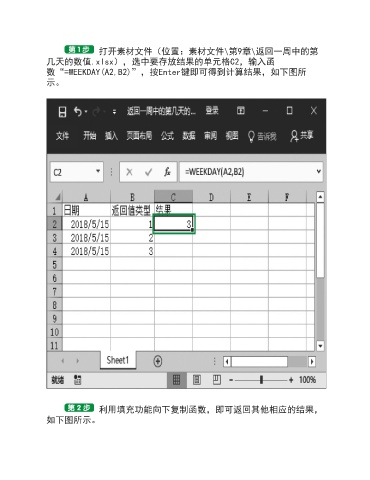 打开素材文件(位置:素材文件\第9章\返回一周中的第 几天的数值.xlsx),选中要存放结果的单元格C2,输入函 数“=WEEKDAY(A2,B2)”,按Enter键即可得到计算结果,如下图所 示。 利用填充功能向下复制函数,即可返回其他相应的结果, 如下图所示。