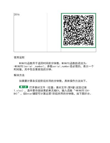 2016 使用说明 MINUTE函数用于返回时间的分钟数。MINUTE函数的语法为: =MINUTE(serial _number),参数serial_number是必需的,表示一个 时间值,其中包含要查找的分钟。 解决方法 如果要计算各实验阶段所用的分钟数,具体操作方法如下。 打开素材文件(位置:素材文件\第9章\实验记录 1.xlsx),选中要存放结果的单元格E4,输入函数“=MINUTE(C4- B4)”,按Enter键即可计算出第1阶段所用的分钟数,如下图所示。