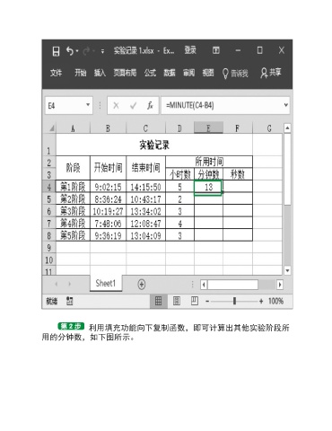 利用填充功能向下复制函数,即可计算出其他实验阶段所 用的分钟数,如下图所示。