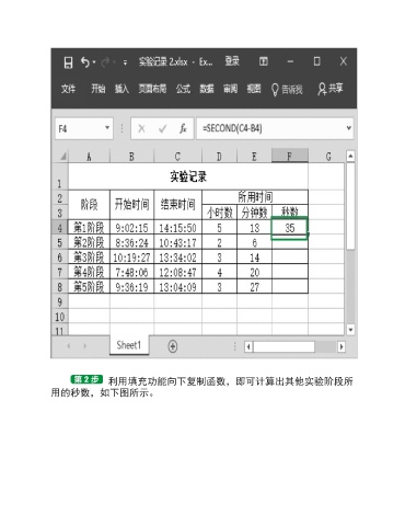 利用填充功能向下复制函数,即可计算出其他实验阶段所 用的秒数,如下图所示。