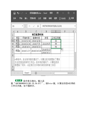 选中单元格E6,输入函 数“=NETWORKDAYS(B5,C5,D6:D7)”,按Enter键,计算出项目4所用的 工作日天数,如下图所示。