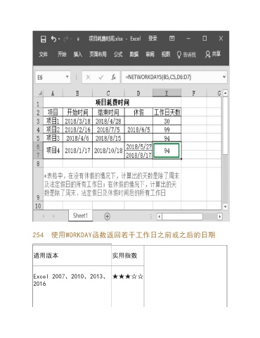 254 使用WORKDAY函数返回若干工作日之前或之后的日期 适用版本 实用指数 Excel 2007、2010、2013、 ★★★☆☆ 2016