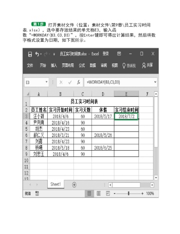 打开素材文件(位置:素材文件\第9章\员工实习时间 表.xlsx),选中要存放结果的单元格E3,输入函 数“=WORKDAY(B3,C3,D3)”,按Enter键即可得出计算结果,然后将数 字格式设置为日期,如下图所示。
