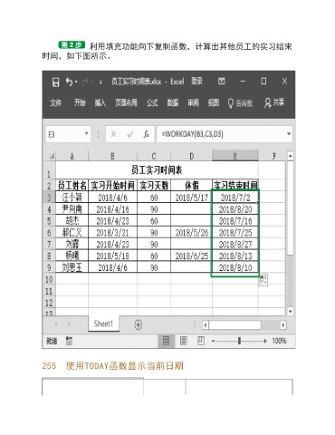 利用填充功能向下复制函数,计算出其他员工的实习结束 时间,如下图所示。 255 使用TODAY函数显示当前日期