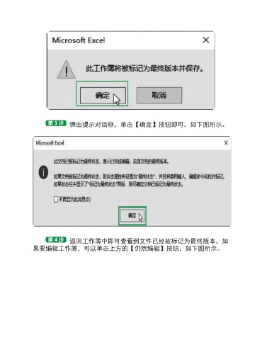弹出提示对话框,单击【确定】按钮即可,如下图所示。 返回工作簿中即可查看到文件已经被标记为最终版本,如 果要编辑工作簿,可以单击上方的【仍然编辑】按钮,如下图所示。