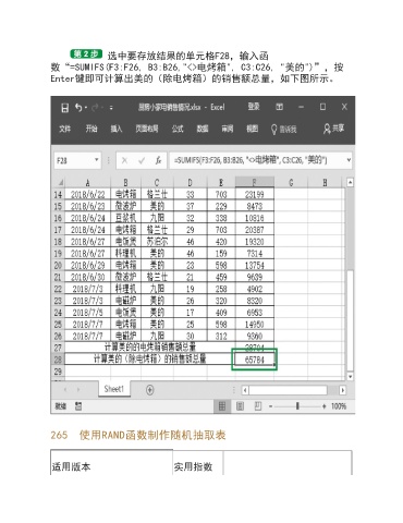 选中要存放结果的单元格F28,输入函 数“=SUMIFS(F3:F26, B3:B26,"<>电烤箱", C3:C26, "美的")”,按 Enter键即可计算出美的(除电烤箱)的销售额总量,如下图所示。 265 使用RAND函数制作随机抽取表 适用版本 实用指数