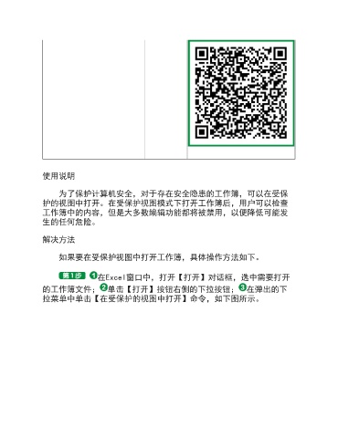 使用说明 为了保护计算机安全,对于存在安全隐患的工作簿,可以在受保 护的视图中打开。在受保护视图模式下打开工作簿后,用户可以检查 工作簿中的内容,但是大多数编辑功能都将被禁用,以便降低可能发 生的任何危险。 解决方法 如果要在受保护视图中打开工作簿,具体操作方法如下。 在Excel窗口中,打开【打开】对话框,选中需要打开 的工作簿文件; 单击【打开】按钮右侧的下拉按钮; 在弹出的下 拉菜单中单击【在受保护的视图中打开】命令,如下图所示。
