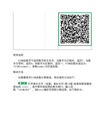 使用说明 SIGN函数用于返回数字的正负号。当数字为正数时,返回1;当数 字为零时,返回0;当数字为负数时,返回-1。SIGN函数的语法为: =SIGN(number),参数number为任意实数。 解决方法 如果要使用SIGN函数计算数据,具体操作方法如下。 打开素材文件(位置:素材文件\第10章\检查销售销量是 否达标.xlsx),选中要存放结果的单元格E4,输入函 数“=SIGN(D4)”,按Enter键即可得到计算结果,如下图所示。