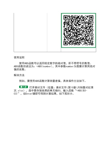 使用说明 使用ABS函数可以返回给定数字的绝对值,即不带符号的数值。 ABS函数的语法为:=ABS(number),其中参数number为需要计算其绝对 值的实数。 解决方法 例如,要使用ABS函数计算销量差值,具体操作方法如下。 打开素材文件(位置:素材文件\第10章\月销量对比情 况.xlsx),选中要存放结果的单元格D3,输入函数“=ABS(B3- C3)”,按Enter键即可得到计算结果,如下图所示。