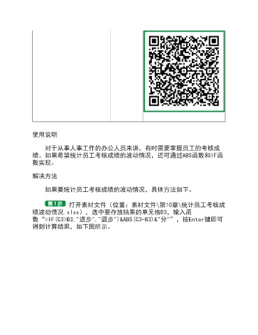 使用说明 对于从事人事工作的办公人员来讲,有时需要掌握员工的考核成 绩。如果希望统计员工考核成绩的波动情况,还可通过ABS函数和IF函 数实现。 解决方法 如果要统计员工考核成绩的波动情况,具体方法如下。 打开素材文件(位置:素材文件\第10章\统计员工考核成 绩波动情况.xlsx),选中要存放结果的单元格D3,输入函 数“=IF(C3>B3,"进步","退步")&ABS(C3-B3)&"分"”,按Enter键即可 得到计算结果,如下图所示。