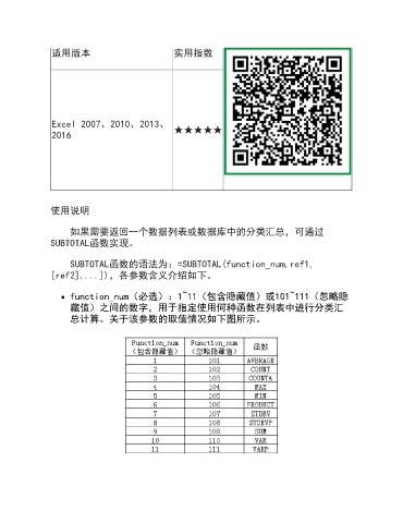 适用版本 实用指数 Excel 2007、2010、2013、 2016 ★★★★★ 使用说明 如果需要返回一个数据列表或数据库中的分类汇总,可通过 SUBTOTAL函数实现。 SUBTOTAL函数的语法为:=SUBTOTAL(function_num,ref1, [ref2],...]),各参数含义介绍如下。 function_num(必选):1~11(包含隐藏值)或101~111(忽略隐 藏值)之间的数字,用于指定使用何种函数在列表中进行分类汇 总计算。关于该参数的取值情况如下图所示。