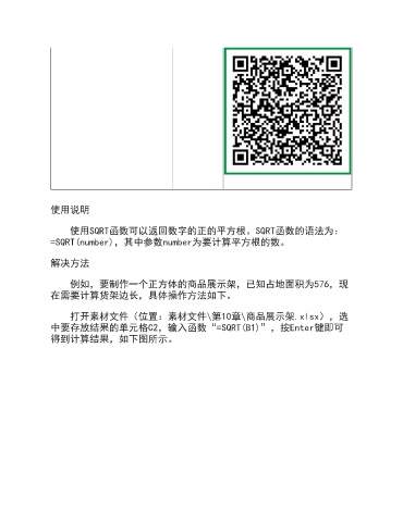 使用说明 使用SQRT函数可以返回数字的正的平方根。SQRT函数的语法为: =SQRT(number),其中参数number为要计算平方根的数。 解决方法 例如,要制作一个正方体的商品展示架,已知占地面积为576,现 在需要计算货架边长,具体操作方法如下。 打开素材文件(位置:素材文件\第10章\商品展示架.xlsx),选 中要存放结果的单元格C2,输入函数“=SQRT(B1)”,按Enter键即可 得到计算结果,如下图所示。