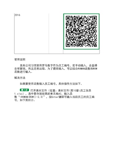 2016 使用说明 某些公司习惯使用罗马数字作为员工编号,若手动输入,会显得 非常繁琐,而且还易出错。为了提高输入,可以结合ROMAN函数和ROW 函数进行输入。 解决方法 如果要使用函数输入员工编号,具体操作方法如下。 打开素材文件(位置:素材文件\第10章\员工信息 1.xlsx),选中要存放结果的单元格A2,输入函 数“=ROMAN(ROW()-2,3)”,按Enter键即可输入当前员工的员工编 号,如下图所示。
