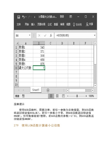 温馨提示 使用GCD函数时,需要注意:若任一参数为非数值型,则GCD函数 将返回错误值#VALUE!;若任一参数小于零,则GCD函数返回错误值 #NUM!;任何数都能被1整除;若GCD函数的参数>=2^53,则GCD函数返 回错误值#NUM!。 279 使用LCM函数计算最小公倍数