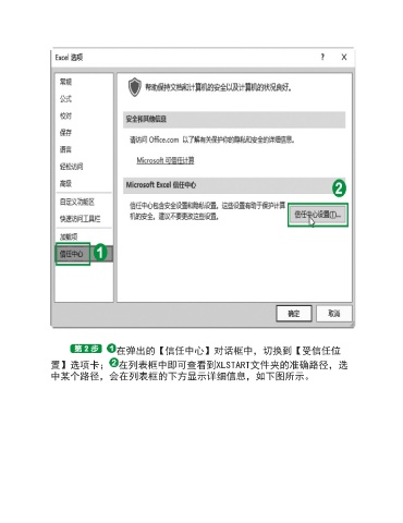 在弹出的【信任中心】对话框中,切换到【受信任位 置】选项卡; 在列表框中即可查看到XLSTART文件夹的准确路径,选 中某个路径,会在列表框的下方显示详细信息,如下图所示。