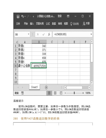 温馨提示 使用LCM函数时,需要注意:如果任一参数为非数值型,则LCM函 数返回错误值#VALUE!;如果任一参数小于0,则LCM函数返回错误值 #NUM!。如果LCM(a,b)>=2^53,则LCM函数返回错误值#NUM!。 280 使用FACT函数返回数字的阶乘