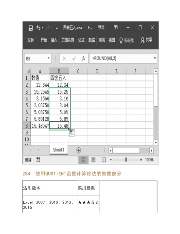 284 使用QUOTIENT函数计算除法的整数部分 适用版本 实用指数 Excel 2007、2010、2013、 ★★★☆☆ 2016