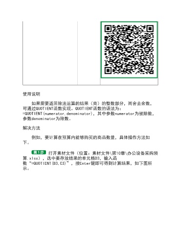 数“=QUOTIENT(B3,C3)”,按Enter键即可得到计算结果,如下图所