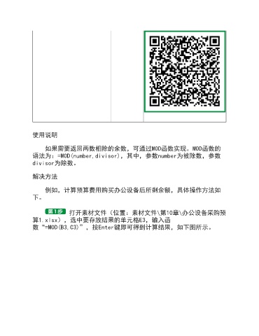 使用说明 如果需要返回两数相除的余数,可通过MOD函数实现。MOD函数的 语法为:=MOD(number,divisor),其中,参数number为被除数,参数 divisor为除数。 解决方法 例如,计算预算费用购买办公设备后所剩余额,具体操作方法如 下。 打开素材文件(位置:素材文件\第10章\办公设备采购预 算1.xlsx),选中要存放结果的单元格E3,输入函 数“=MOD(B3,C3)”,按Enter键即可得到计算结果,如下图所示。