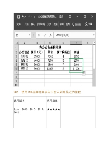 286 使用INT函数将数字向下舍入到最接近的整数 适用版本 实用指数 Excel 2007、2010、2013、 ★★★★★ 2016