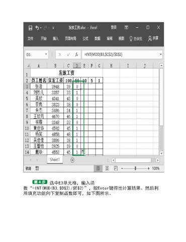 选中E3单元格,输入函 数“=INT(MOD(B3,$D$2)/$E$2)”,按Enter键得出计算结果。然后利 用填充功能向下复制函数即可,如下图所示。