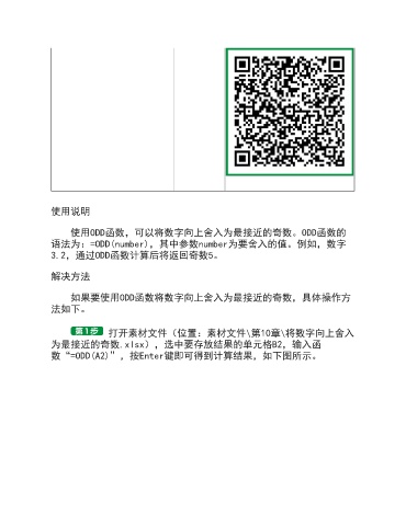 使用说明 使用ODD函数,可以将数字向上舍入为最接近的奇数。ODD函数的 语法为:=ODD(number),其中参数number为要舍入的值。例如,数字 3.2,通过ODD函数计算后将返回奇数5。 解决方法 如果要使用ODD函数将数字向上舍入为最接近的奇数,具体操作方 法如下。 打开素材文件(位置:素材文件\第10章\将数字向上舍入 为最接近的奇数.xlsx),选中要存放结果的单元格B2,输入函 数“=ODD(A2)”,按Enter键即可得到计算结果,如下图所示。