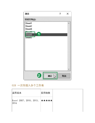 028 一次性插入多个工作表 适用版本 实用指数 Excel 2007、2010、2013、 ★★★★★ 2016