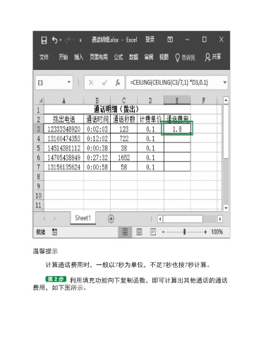温馨提示 计算通话费用时,一般以7秒为单位,不足7秒也按7秒计算。 利用填充功能向下复制函数,即可计算出其他通话的通话 费用,如下图所示。