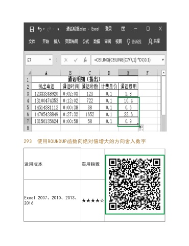 293 使用ROUNDUP函数向绝对值增大的方向舍入数字 适用版本 实用指数 Excel 2007、2010、2013、 2016 ★★★★☆