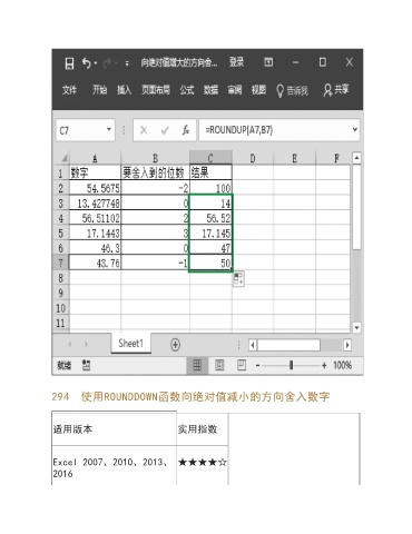 294 使用ROUNDDOWN函数向绝对值减小的方向舍入数字 适用版本 实用指数 Excel 2007、2010、2013、 ★★★★☆ 2016