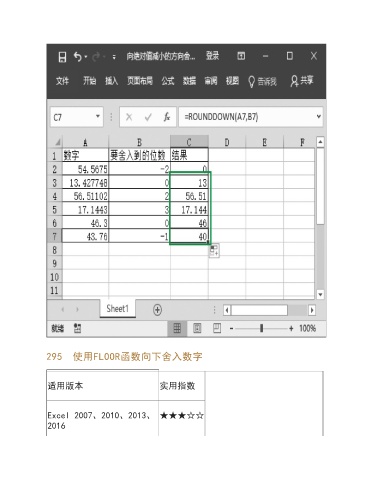 295 使用FLOOR函数向下舍入数字 适用版本 实用指数 Excel 2007、2010、2013、 ★★★☆☆ 2016