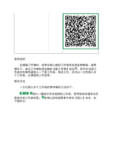 使用说明 在编辑工作簿时,经常会插入新的工作表来处理各种数据。通常 情况下,单击工作表标签右侧的【新工作表】按钮 ,即可在当前工 作表的右侧快速插入一个新工作表。除此之外,还可以一次性插入多 个工作表,以便提高工作效率。 解决方法 一次性插入多个工作表的具体操作方法如下。 按Ctrl键选中多张连续的工作表,使用鼠标右键单击任 意选中的工作表标签; 在弹出的快捷菜单中单击【插入】命令,如 下图所示。