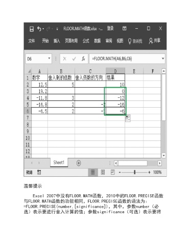 温馨提示 Excel 2007中没有FLOOR.MATH函数,2010中的FLOOR.PRECISE函数 与FLOOR.MATH函数的功能相同,FLOOR.PRECISE函数的语法为: =FLOOR.PRECISE(number,[significance]),其中,参数number(必 选)表示要进行舍入计算的值;参数significance(可选)表示要将
