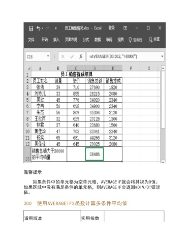 温馨提示 如果条件中的单元格为空单元格,AVERAGEIF就会将其视为0值; 如果区域中没有满足条件的单元格,则AVERAGEIF会返回#DIV/0!错误 值。 300 使用AVERAGEIFS函数计算多条件平均值 适用版本 实用指数