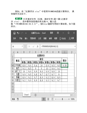 例如,在“比赛评分.xlsx”中使用TRIMMEAN函数计算得分, 具 体操作方法如下。 打开素材文件(位置:素材文件\第11章\比赛评 分.xlsx),选中要存放结果的单元格I4,输入函 数“=TRIMMEAN(B4:H4,0.3)”,按Enter键即可得到计算结果,如下图 所示。