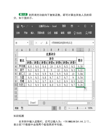 利用填充功能向下复制函数,即可计算出其他人员的得 分,如下图所示。 知识拓展 在本例中输入函数时,还可以输入为:=TRIMMEAN(B4:H4,2/7), 表示在7个数据中去除两个极值再求平均值。