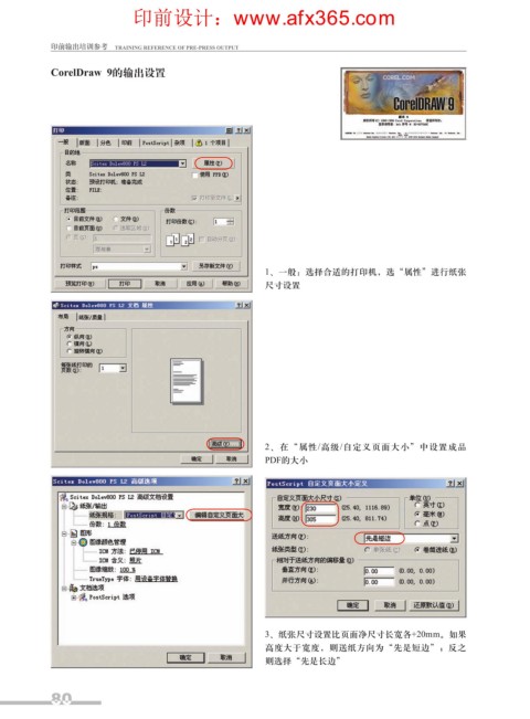 ႆభഡ࠹ğXXX BGY DPN 印前输出培训参考 TRAINING REFERENCE OF PRE-PRESS OUTPUT CorelDraw 9的输出设置 1、一般:选择合适的打印机,选“属性”进行纸张 尺寸设置 2、在“属性/高级/自定义页面大小”中设置成品 PDF的大小 3、纸张尺寸设置比页面净尺寸长宽各+20mm。如果 高度大于宽度,则送纸方向为“先是短边”;反之 则选择“先是长边” 80 80