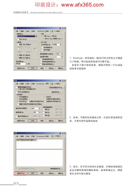 ႆభഡ࠹ğXXX BGY DPN 印前输出培训参考 TRAINING REFERENCE OF PRE-PRESS OUTPUT 7、PostScript:因为我们一般对CDR文件的文字都进 行了转曲,所以此处的选项可以都不选。 如果有下载字体的需要,增加平滑的三个自动选 项需要全部选择 8、杂项:不使用色彩描述文件,注意打样选项的设 置,不要有替代选择的选项 9、项目:有不符合的项目会报错,仔细查看报错信 息会有哪些影响印刷结果的,如果影响过大,则需 要从文件中进行修改 82 82