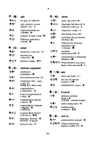 추 b e ugly; b e indecent 수축* shrin a g e [bind-] 收~