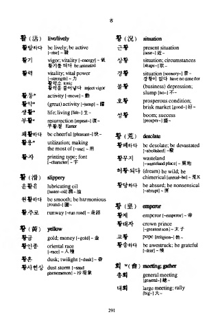 활력 vitality; vital p o w e r 경황 situation [scenery-] 景 -
