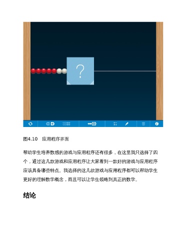 图4.10 应用程序界面 帮助学生培养数感的游戏与应用程序还有很多,在这里我只选择了四 个,通过这几款游戏和应用程序让大家看到一款好的游戏与应用程序 应该具备哪些特点。我选择的这几款游戏与应用程序都可以帮助学生 更好的理解数学概念,而且可以让学生领略到真正的数学。 结论
