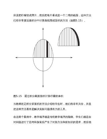 应该把柠檬切成薄片,然后把每片看成是一个二维的截面,这种方法 已经非常接近微积分中计算曲线围成面积的方法(如图5.15)。 图5.15 通过积分截面面积计算柠檬的体积 当教师把定积分算面积的方法介绍给学生时,他们都非常兴奋,并且 把这种方法看作是解决实际问题强有力的工具。 在这两个案例中,教学顺序都是传统教学顺序的颠倒。学生们都是在 对问题进行了思考和探索后产生了对新方法和新知识的需求,然后他