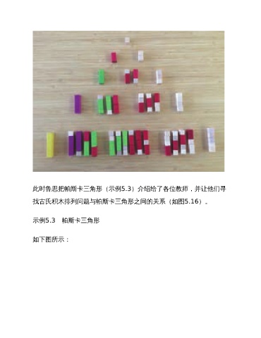 此时鲁思把帕斯卡三角形(示例5.3)介绍给了各位教师,并让他们寻 找古氏积木排列问题与帕斯卡三角形之间的关系(如图5.16)。 示例5.3 帕斯卡三角形 如下图所示: