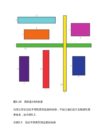 图5.20 面积是24的矩形 与其让学生记住不同性质四边形的名称,不如让他们自己去根据性质 来命名,如示例5.5。 示例5.5 说出不同类型四边形的名称