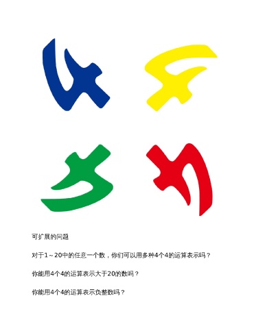 可扩展的问题 对于1~20中的任意一个数,你们可以用多种4个4的运算表示吗? 你能用4个4的运算表示大于20的数吗? 你能用4个4的运算表示负整数吗?