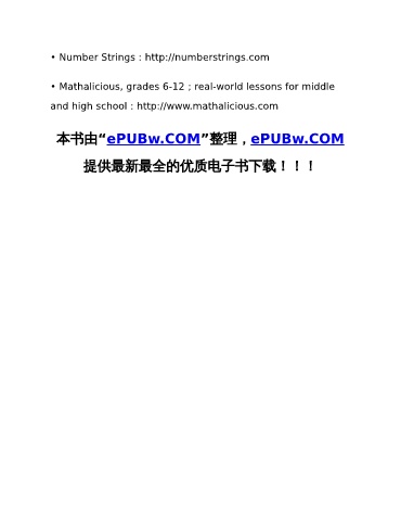 • Number Strings:http://numberstrings.com • Mathalicious, grades 6-12;real-world lessons for middle and high school:http://www.mathalicious.com 本书由“ePUBw.COM”整理,ePUBw.COM 提供最新最全的优质电子书下载!!!
