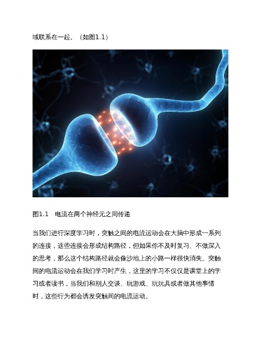 域联系在一起。(如图1.1) 图1.1 电流在两个神经元之间传递 当我们进行深度学习时,突触之间的电流运动会在大脑中形成一系列 的连接,这些连接会形成结构路径,但如果你不及时复习、不做深入 的思考,那么这个结构路径就会像沙地上的小路一样很快消失。突触 间的电流运动会在我们学习时产生,这里的学习不仅仅是课堂上的学 习或者读书,当我们和别人交谈、玩游戏、玩玩具或者做其他事情 时,这些行为都会诱发突触间的电流运动。