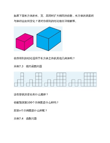 如果下面长方体的长、宽、高同时扩大相同的倍数,长方体的表面积 与体积会如何变化?请对你得到的结论做出详细解释。 你所得到的结论适用于长方体之外的其他几何体吗? 示例7.3 线性函数问题 这些形状的变化有什么规律? 你能预测第100个示例图是什么样吗? 那第n个示例图是什么样呢? 示例7.4 函数问题