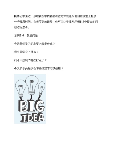 能够让学生进一步理解所学内容的有效方式就是为他们在课堂上提供 一些反思时间。在每节课的最后,你可以让学生对示例8.4中提出的问 题进行思考。 示例8.4 反思问题 今天我们学习的主要内容是什么? 我今天学会了什么? 我今天想到了哪些好点子? 今天所学的知识在哪些情况下可以使用?