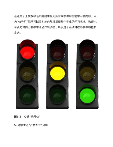 会让桌子上摆放绿色纸杯的学生为所有同学讲解当前学习的内容。因 为“信号灯”活动可以及时地向教师反馈每个学生的学习状况,教师也 可及时对自己的教学活动作出调整,所以这个活动对教师的帮助也非 常大。 图8.5 交通“信号灯” 5. 对学生进行“拼图式”分组